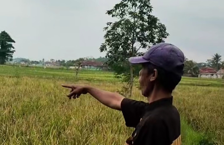 Salah seorang petani di Kecamatan Ciranjang, Cianjur, saat menunjuk hamparan tanaman padi yang diserang hama burung pipit.