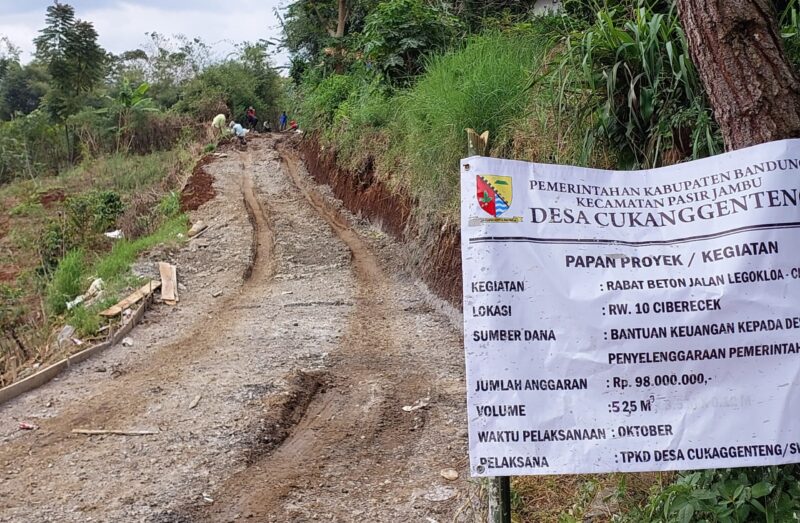 BANDUNG – Pemerintah Desa (Pemdes) Cukanggenteng, Kecamatan Pasirjambu, Kabupaten Bandung, saat ini sedang ngebut menyelesaikan pembangunan jalan rabat beton sepanjang 145 meter di RW 10, Jalan Legokloa–Ciberecek. Proyek ini menggunakan dana Bantuan Provinsi (Banprov) Jawa Barat Tahun Anggaran 2025 senilai Rp98 juta.