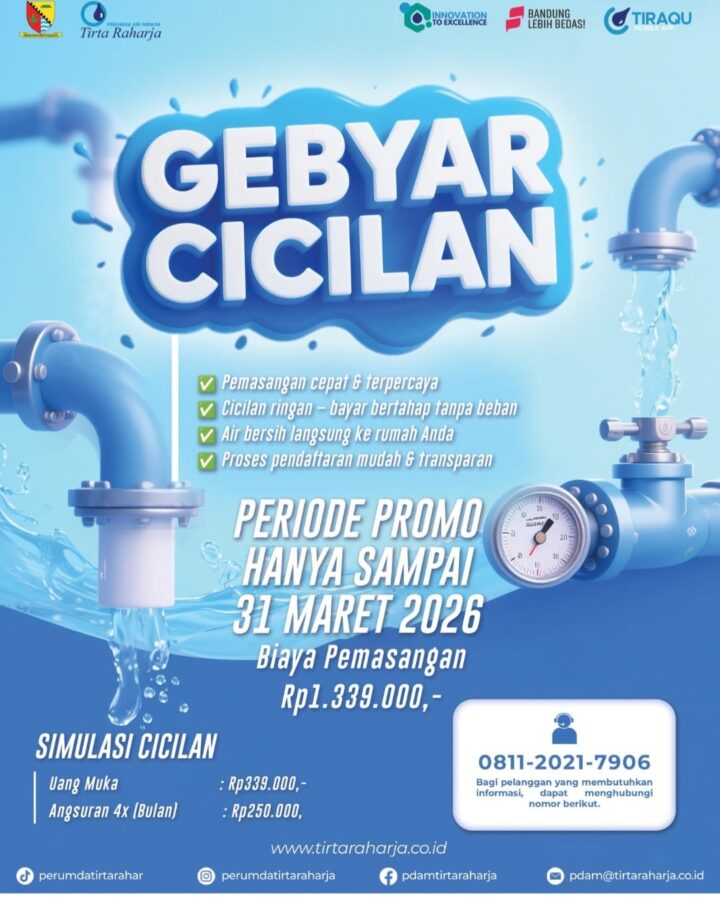 “Ayo nikmati kemudahan pemasangan sambungan rumah baru dengan angsuran sangat terjangkau,” ujar Direktur Utama Perumda Air Minum Tirta Raharja Drs. A. Teddy Setiabudi, M.T., melalui staf Humas Perumda Tirta Raharja, Anggi Saputra, Jumat (30/1/2026).